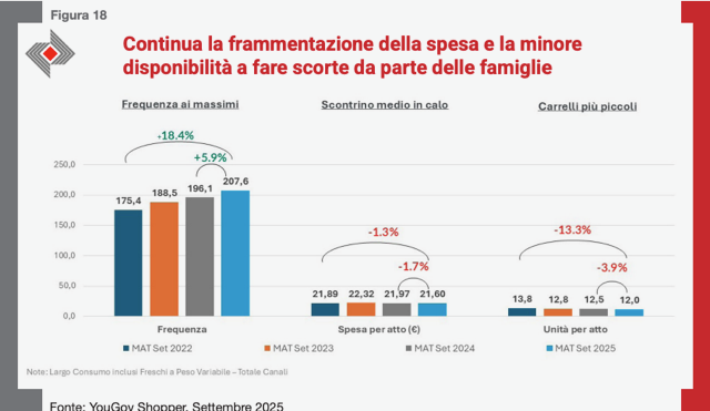 Se da un lato la complessità delle esperienze di vita rende obsolete le rigide etichette generazionali, dall’altro questa fluidità riflette un fenomeno più profondo: la centralità crescente dell’individualismo nel rapporto tra persona e mercato. Inoltre, questa evoluzione dell’individuo si riflette anche nelle dinamiche familiari e nei comportamenti d’acquisto collettivi. Nel 2025, infatti, il comportamento d’acquisto delle famiglie italiane continua a mutare in modo profondo e strutturale, riflettendo sia i cambiamenti nei modelli di vita che le nuove condizioni economiche e culturali. Una delle tendenze più evidenti è la frammentazione degli atti di spesa: si compra più spesso, ma si acquistano meno prodotti per volta. Il carrello medio si è ridotto per effetto dell’inflazione e della prudenza economica, oltre che per l’affermarsi di una logica diversa nel rapporto con il consumo quotidiano.