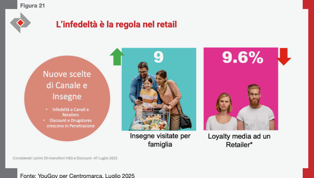 Questa trasformazione risponde a molteplici spinte. Da un lato, la crescente attenzione alla lotta contro gli sprechi alimentari e alla gestione efficiente delle risorse domestiche spinge le persone a pianificare meglio e a razionalizzare gli acquisti. Continua la frammentazione della spesa e la minore disponibilità a fare scorte da parte delle famiglie; freschezza, varietà e controllo nella propria dieta e nella spesa in generale. Il supermercato, il mercato rionale, il discount o l’e-commerce vengono vissuti come tappe ricorrenti di una routine quotidiana o settimanale, in cui la spesa si intreccia al tempo libero, al benessere e alla gestione delle emozioni, anziché come semplici “luoghi della provvista”. Parallelamente, si osserva una crescente strategia nella gestione del portafoglio domestico. Il consumatore è diventato un vero e proprio “navigatore del mercato”: compara prezzi, verifica promozioni, alterna canali d’acquisto, valuta convenienza e coerenza etica del venditore. L’infedeltà commerciale è diventata la norma, non più un’eccezione. Le famiglie passano con disinvoltura da una catena all’altra, da un formato all’altro, da un marchio all’altro. È una fluidità guidata dal prezzo e da molteplici criteri: prossimità, qualità, valore percepito, esperienza d’acquisto, relazioni umane.