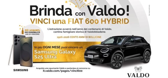 Valdobbiadene (Tv) – Per dare inizio ai festeggiamenti che, nel 2026, la vedranno compiere 100 anni di storia, Valdo Spumanti, di proprietà della famiglia Bolla da tre generazioni, dedica ai consumatori un concorso che mette in palio premi mensili e un super premio finale - una Fiat 600 Hybrid - che sarà estratto entro il
