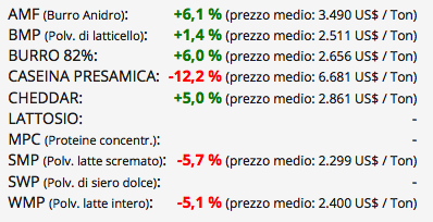 Fonterra (Nz) – Si è svolta ieri la consueta asta quindicinale della piattaforma GlobalDairyTrade, presso la cooperativa neozelandese Fonterra, per burro anidro (Amf), latticello in polvere (Bmp), polvere di latte scremato (Smp), polvere di latte intero (Wmp), proteine concentrate del latte (Mpc), caseina presamica e formaggio cheddar. La prossima asta è prevista per martedì 2 dicembre.