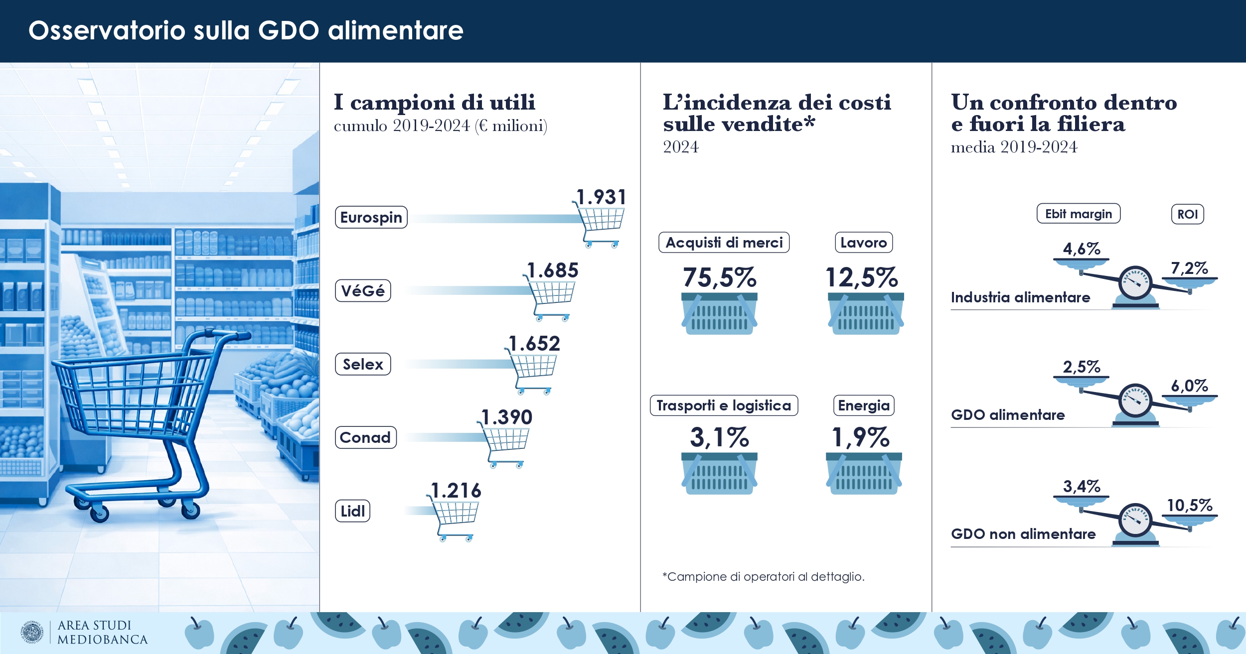Tra il 2019 e il 2024, le vendite sono aumentate del 30,9% con un tasso medio annuo del 5,5%. In crescita i ricavi derivanti da attività promozionali (+4,1% all’anno tra il 2019 e il 2024) pari al 6,5% delle vendite; i ricavi immobiliari sono l’1,2%. La Gdo conferma l’alta incidenza del costo del lavoro: i costi del personale dei retailer nazionali rappresentano mediamente il 12,5% delle vendite, quelli per trasporti e logistica il 3,1% e i costi dell’energia l’1,9%.